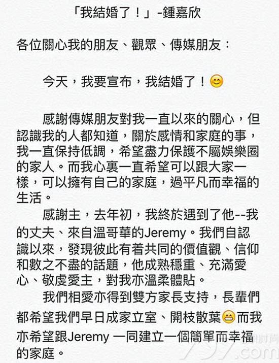 钟嘉欣昨天终于亲自撰写长文直认已婚,丈夫是圈外人Jeremy。钟嘉欣透露去年初认识来自温哥华的Jeremy,“我们自认识以来,发现彼此有着共同的价值观、信仰和数之不尽的话题,他成熟稳重、充满爱心、敬虔爱主,对我也温柔体贴。”钟嘉欣认定Jeremy就是她的一生挚爱,终于在去年秋天,Jeremy向她求婚,她便答应了。去年底,他俩便在双方家长见证下,采用宗教仪式,进行了庄严而简单的婚礼。他们也尊重长辈们的意愿,择一个良辰吉日,于本周末(27日)补摆喜酒,与一些亲朋戚友分享喜悦。