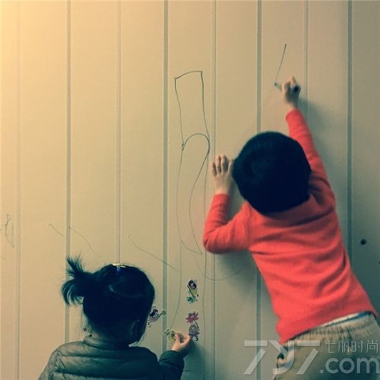 照片中的等等撅着屁股趴在墙上,手拿黑色画笔,专心致志的在墙上“创作”,而一旁的妹妹小花也学着哥哥的样子,往墙上贴卡通贴纸,兄妹了玩的不亦乐乎,画面十分温馨和谐。
