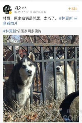 2月26日下午,林更新调侃邻居家养了两只傻狗,并晒出两只狗狗的傻萌照片。随后狗狗的女主人出现了,po出一张狗狗的可爱合影,并回应林更新。