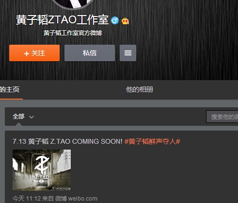 7月10日,黄子韬工作室官方微博发布了一张概念海报,并配文“7.13 黄子韬 Z.TAO COMING SOON!”这也预告着黄子韬将携自己的首张个人专辑大碟回归到大众的事业。