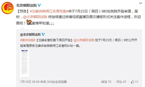 7月23日据北京市朝阳区人民法院官方微博消息,北京朝阳法院将于23日上午9点,开庭审理汪峰诉韩炳江(卓伟)名誉权案。