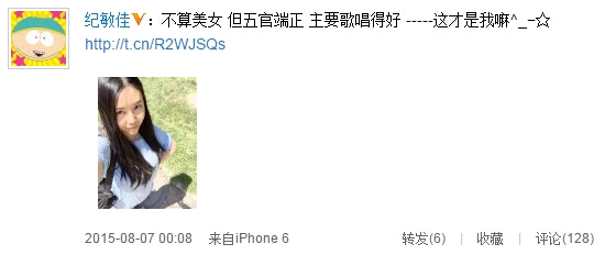 7日,纪敏佳在个人微博上晒出了一张素颜照,并配文:“不算美女,但五官端正主要,歌唱得好——这才是我嘛”。图中的纪敏佳大方素颜,皮肤白皙长发披肩,露出腼腆的微笑。