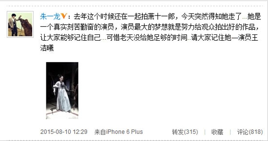 今日,演员王洁曦的好友朱一龙在微博上追悼称:“演员最大的梦想就是努力给观众拍出好的作品,让大家能够记住自己……可惜老天没给她足够的时间……请大家记住她—演员王洁曦!”张含韵也转发表示震惊:“不敢相信这是真的,前几日配音时看到你的画面,觉得你那么美那么文静又乖巧……实在太突然了。我的小射手,在天堂一切都会好的。缘,来世再续。”合作《卫子夫》的王珞丹也微博悼念。