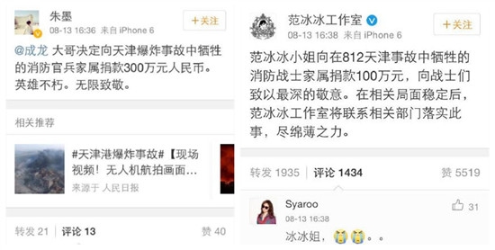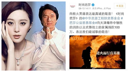 另外,今日下午,范冰冰、成龙、芭莎娱乐等纷纷以实际行动捐款,表示略尽微薄之力,帮助天津共度难关,同时也祈福天津平安。