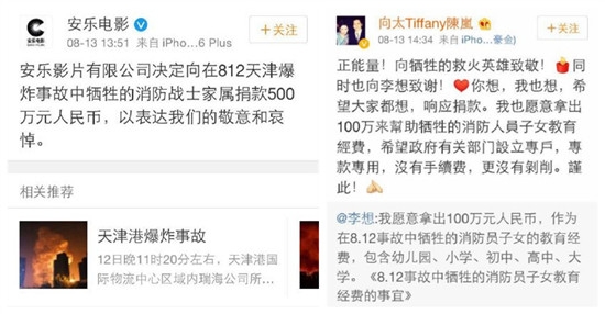 8月12日晚11时许,天津滨海新区一处集装箱码头发生爆炸,众多明星纷纷发文为天津祈福,为消防战士祝祷平安。