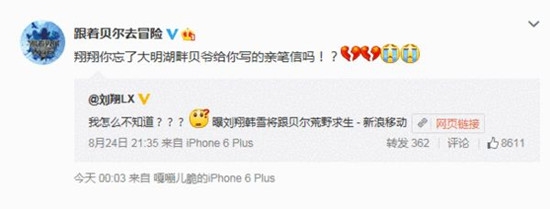 近日,有人爆料称刘翔退役之后将加盟真人秀节目《跟着贝尔去冒险》,此前,有消息称《跟着贝尔去冒险》将于9月正式开拍。对此,刘翔于8月24日晚给出回应,予以否认,并表示:“我怎么不知道?”随后,节目组对此事予以回应,称“翔翔你忘了大明湖畔贝爷给你写的亲笔信吗!?”疑在指其实和刘翔有过沟通。