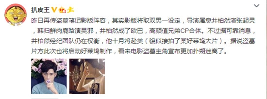 据某微博大V爆料,电影版《盗墓笔记》迟迟未公开主演阵容,疑似另有玄机,影版将取双男一设定,导演属意井柏然演张起灵,韩归鲜肉鹿晗演吴邪,井柏然成了欧巴,高颜值兄弟CP合体。不过据可靠消息,井柏然经纪团队仍在权衡,他十月将赴美,貌似接拍了某好莱坞大片。因此,被外界誉为“20亿影帝”的井柏然到底最终会做何选择,还有待考证。