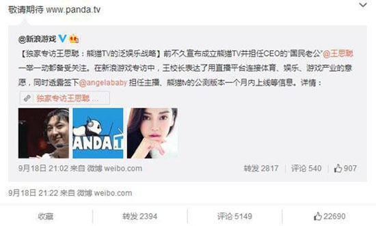 近日,网传万达公子,游戏玩家们亲切称呼的“王校长”王思聪近日签约了当红女星Angelababy当其投资并担任CEO的游戏直播平台PandaTV。消息一出,更大媒体争相报道,王思聪正式进军直播平台一事也迅速传开。