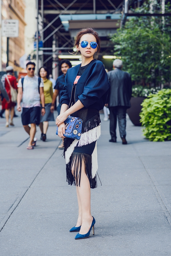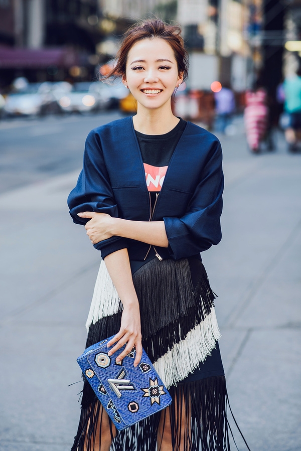 本次街拍中,张靓颖身着Stella McCartney黑色泡袖短款外套,搭配Cedric Charlier紧身流苏裙,时髦潮流中映射出民族古典美,个性的印花手包,趣感十足,同时也呼应整体着装的格调,深蓝色的尖头高跟鞋,完美修饰白皙的美腿,散发出淡淡的典雅。