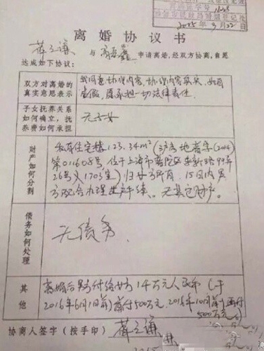 今日,两人离婚协议曝光,协议显示两人无子女,薛之谦将给女方一千万,外加上海一栋楼。传两人结婚在2012年,妻子高磊鑫是模特,身材好长的非常漂亮。据了解薛之谦这几年,开火锅服装店等收入颇丰。