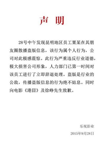 28日早,导演徐峥在朋友圈发文称《港囧》被盗版传播:“从昨天起《港囧》在网上盗版出现有规模有组织的投放”,并控诉道:“义正言辞的话不想多说了,这是行业的灾难。”随后,乐视影业在官微发布声明,称发现公司昆明地区员工粟某在朋友圈散播《港囧》盗版信息,强调“该行为属于个人行为,公司对其极感震惊。”同时,乐视影业也表示已将该员工辞退,并向《港囧》和徐峥道歉。