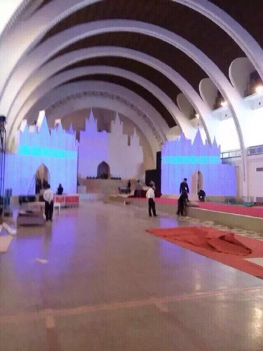 今日,黄晓明Angelababy二人婚礼将在上海展览中心举办盛大婚礼,有媒体成功突围拍得会场内部情况,以城堡及阶梯等布置舞台,极具童话公主feel。至于会场外的布置已大致完成,水池两旁有spotlight投射出“ah”字样,中间大台亦有白色“ah”logo,装饰富宫廷风格。