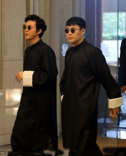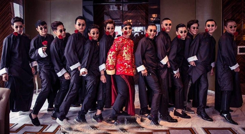 伴郎团井柏然、黄渤、小沈阳、吴京、李云迪、佟大为、王宝强等之前媒体曝光过的伴郎团成员纷纷现身。在大婚仪式前,黄晓明在朋友圈晒出与兄弟伴郎团的合影,并附文 “将逗逼进行到底”。照片中大家都戴圆形墨镜,黄晓明穿着中式服装很显眼