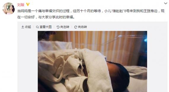 刘璇发布微博称:“当妈妈是一个痛与幸福交织的过程,经历十个月的等待,小儿‘雄赳赳’8号来到我和王弢身边,现在一切安好,与大家分享此时的幸福。”刘璇曾经直言如果是儿子希望从小学体操学会吃苦和感恩。