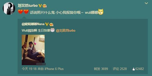 随后其绯闻女友欧阳娜娜发微博祝福,并且发了张刘昊然比较私密自拍的照片,刘昊然马上转发了欧阳娜娜的微博,并回复道:“话说照片什么鬼,小心我报复你哦~ wuli娜娜。