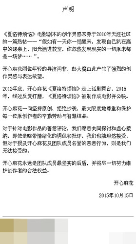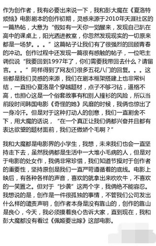 就在昨晚,开心麻花在微博上也对此事作出了回应:“开心麻花一向坚持原创、拒绝抄袭,尊重和保护每一位原创作者的辛勤劳动与智慧结晶。对于针对电影作品的评论,即使是略带情绪化的调侃和批评,也能坦然接受,但对损及开心麻花及团队成员名誉的恶意行为,则是我们无法接受的。开心麻花永远是团队成员最坚实的后盾,并将尽一切努力维护创作者的合法权益。”并发表了长微博,如下: