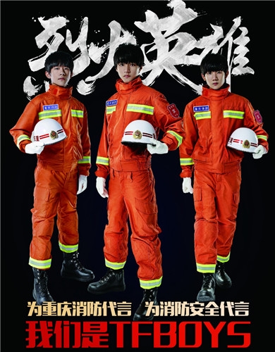 11月3日,当红小鲜肉TFboys在微博晒照并说道:“他们是‘逆行’的勇士,他们是烈火中的英雄,他们是冲在第一线保护我们平安的战士。在119消防日来临之际,TFBOYS出任重庆消防公益代言人,为消防安全代言。让我们一起学习消防知识,支持消防工作!”照片中三只小青年穿上了消防服化身正能量小战士,网友好评不断,纷纷为三只的举动点赞。