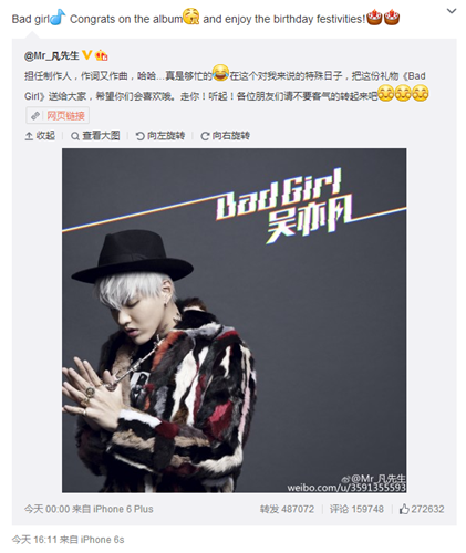今天是吴亦凡的生日同时他的新歌《Bad Girl》今天也首发。以前同是SM公司的少女时期前成员Jessica今天转发了该微博并留言:Bad girl Congrats on the album and enjoy the birthday festivities!不知道SM公司看到此景会不会气死呢?