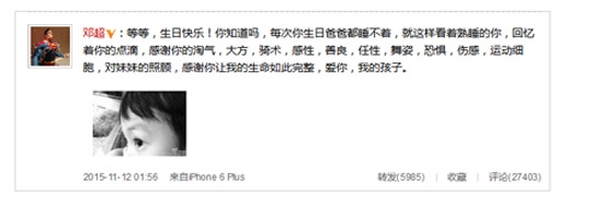 邓超为儿子等等庆生,今日凌晨,邓超更新微博庆祝儿子等等的4岁生日,附上儿子半张侧脸的照片,照片中等等的眼睛和长睫毛十分抢镜,并且微博他深情地写道:“等等,生日快乐!感谢你的淘气、大方、骑术、感性、善良、任性、舞姿、恐惧、伤感、运动细胞、对妹妹的照顾,感谢你让我的生命如此完整,爱你,我的孩子。