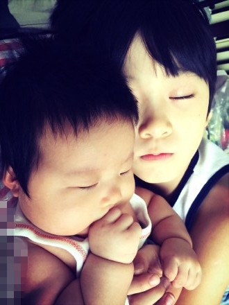 照片中,天天抱这妹妹微笑着望着镜头,画面非常温馨。日渐长大的天天也越来越帅气。