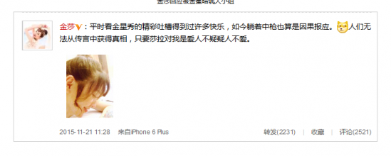 随后金莎针对这一问题微博作出回应:“平时看金星秀的精彩吐槽得到过许多快乐,如今躺着中枪也算是因果报应。人们无法从传言中获得真相,只要莎拉对我是爱人不疑疑人不爱。”
