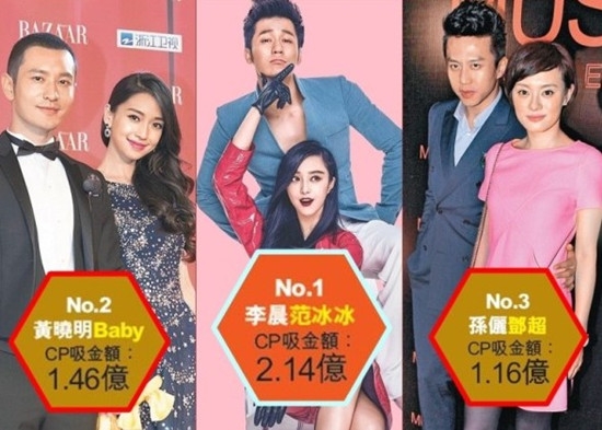 明星的吸金能力是有目共睹的,更别说CP档强强联手。今年范冰冰与李晨吸金1.7亿人民币成为最赚钱的明星情侣,黄晓明杨颖、邓超孙俪分列二、三。
