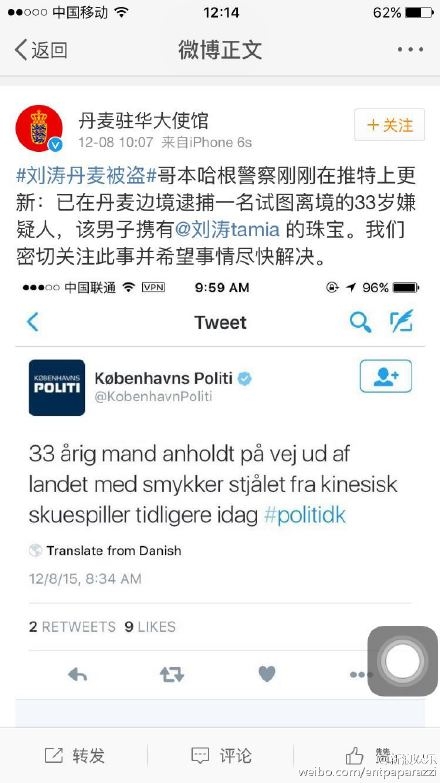 据哥本哈根警察在推特上更新称,已在丹麦边境逮捕一名试图离境的33岁嫌疑人,该男子携有刘涛的珠宝。丹麦驻华大使馆表示,他们将密切关注此事并希望事情可以尽快解决。