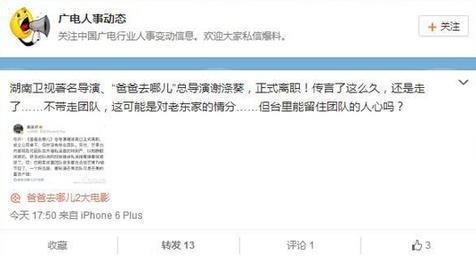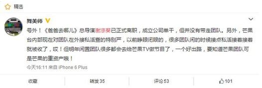 终于坐实了,谢涤葵终究没有抵挡高薪诱惑,或选择加盟竞争对手团队,或创业。值得一提的是,谢涤葵没有带走《爸爸去哪儿》的核心团队,但是估计湖南卫视也很难留住人才了。假如谢涤葵在别的公司混得越来越好,原来底下的那些人肯定会投奔谢涤葵而去的。