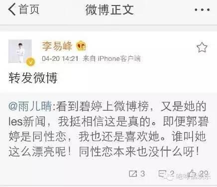 明星点赞其实是揭露了事情的真实本质。比如说,李易峰就转发了郭碧婷是同性恋的新闻。此前就有盛传国民老公郭碧婷是同性恋的传闻,也有人趴出前因后果。李易峰神助攻!