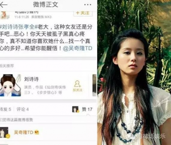 刘诗诗在和张孝全拍戏时,被传有绯闻。有吴奇隆的粉丝发微博为偶像抱不平:“老大,这种女友还是分手吧…恶心!你天天被虱子黑真心疼你,真不知道你喜欢她什么…找一个真心的多好…希望你能醒悟。”吴奇隆竟然手滑点了赞,事后他解释:“八卦新闻太多,拜读之中手滑又成一八卦。给关心的朋友添乱真抱歉。给好事抹黑者多一乐事,就当我配合你们娱乐一次,但八卦恶炒者能消停会吗?我们很好,谢谢大家!”随后刘诗诗转发吴奇隆微博调侃:“再敢手滑就剁手!”