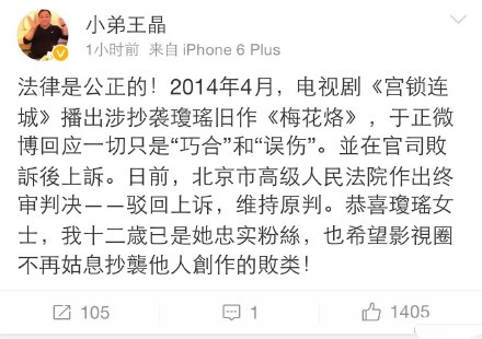 近十九个月的诉讼历程,台湾著名作家琼瑶《梅花烙》著作权维权案终审落幕,北京市高级人民法院一锤定音:驳回各被告上诉请求,维持原判!于正败诉,被告共赔500万.