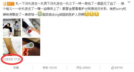 关注娱乐圈的粉丝一定看到了这则消息:李冰冰连续高烧16天虚脱到无法行走后来暂缓国外拍片连夜飞回国内治疗。12月06日,李冰冰曾在微博上晒出一组在国外生病住院的照片称:扎一下没扎进去,扎两下没,扎三下,呼,鼓包了,里面见了血了?换个地儿,一针扎进去了,噗,血喷床上了!眼冒金星看着护士刚想说没关系,但吃掉转身飘走了。这都第几天喷血了,我是跨越半个地球来给她们练手的吗?体温都急得蹭蹭往上冒了。如今掐指一算已经有半月有余了,那么李冰冰究竟是感冒还是有别的重病呢?