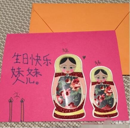 12月20日,黄磊更新微博庆祝小女儿两周岁的生日,他晒出一张多多制作的生日贺卡,并写道“亲爱的妹妹人儿,生日快乐!爸爸妈妈姐姐永远永远爱你哟!”贺卡上有两个姐妹的可爱画像,多多还在贺卡上写道“生日快乐妹妹人儿”。打开贺卡多多还用英文为她最爱的妹妹送上生日祝福,并画上了一副充满童趣的画。