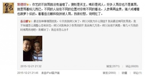 郭德纲安慰岳云鹏,揭郭德纲被骂背叛师门内幕,12月21日晚,岳云鹏在微博晒出和师傅郭德纲合影,并称是因为有网友骂他,心情低落所以到郭德纲这里来找安慰,而郭德纲却说要等到有更多的网友骂再来。