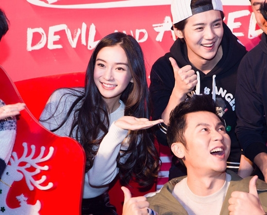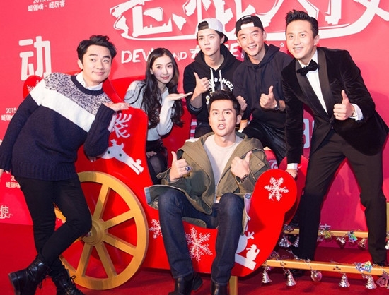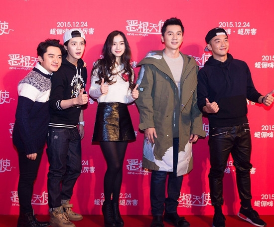 Angelababy携手跑男团亮相电影《恶棍天使》的北京首映礼,为好兄弟邓超宣传助阵。