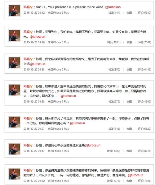 邓超示爱孙俪,连发10条高能虐狗,邓超兑现快本大本营承诺,两人打赌,邓超获胜则孙俪献吻,孙俪获胜则邓超微博示爱。20日邓超半小时内连发10条微博示爱孙俪!“你是我的毒药,控制我的大脑”“我的灵魂好像被你摄去了一般”“如果没有你,我想我会断电”“你最大的优点就是你的眼光”“孙俪,自从那次见了你之后,我的灵魂好像被你摄去了一般,你的影子,占据了我每一个记忆。你能理解我的痴心吗?”,用尽世间赞美。
