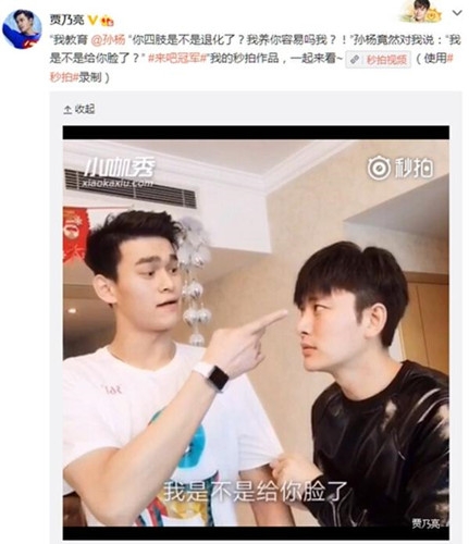 22日,贾乃亮在微博分享搞笑视频,更晒出与孙杨表演的视频,视频中,两人模仿了电影《夏洛特烦恼》中的经典片段。孙杨先是在贾乃亮的厉声训斥中扮出一副楚楚可怜的委屈模样;接着两人又互换角色,孙杨霸气地“反击”,指着贾乃亮恶狠狠地吼道“我是不是给你脸了?”随后便一把推开贾乃亮的脑袋喊着“你给我起开!”