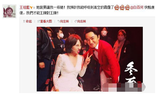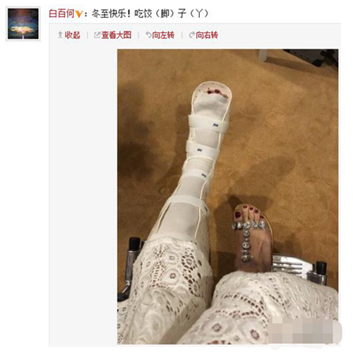 昨日,白百何在微博晒出左腿受伤的照片,并打趣称:“冬至快乐!吃饺(脚)子(丫)。”黄晓明和李晨分别拿着签字笔在白百何打着绷带的腿上签名,使白百何瞬间变成小粉丝的样子,坐在轮椅上高兴比起了V字拍照。