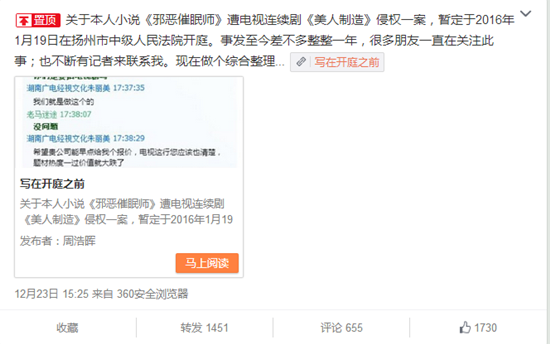 据悉,周浩晖去年就发表微博宣布,自己将起诉于正新剧《美人制造》涉嫌抄袭自己的小说《邪恶催眠师》。并上传20多位网友表示《美人制造》抄袭《邪恶催眠师》的微博截图,并表示:“本来不想耗费精力的,但这两天回过味来--我这种态度不是鼓励继续抄吗?所以又改变主意了。于正,琼瑶阿姨那边的案子下午就要判了吧?不管啥结果,你和你的律师都别歇着,准备第二场哦。”