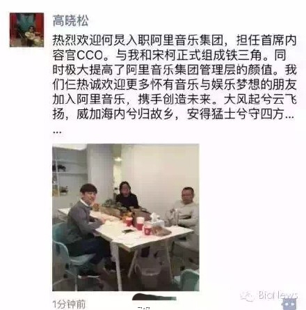 何炅入职阿里音乐任CCO,与高晓松宋柯组成铁三角,高晓松微博称何炅将入职阿里音乐,担任CCO(首席内容官),并晒出两人与CEO宋柯的合影称:“热烈欢迎何炅入职阿里音乐集团,担任首席内容官CCO,与我和宋柯正式组成铁三角。