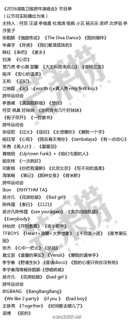 谢娜缺席湖南卫视跨年晚会 完整节目单流程抢先曝光
