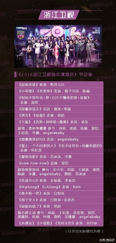 浙江卫视2016跨年演唱会节目单曝光 鹿晗邓超上演超级换装秀