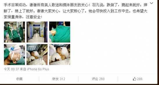 有媒体报道称,歌手陈羽凡在工作中也不幸摔伤,致锁骨骨折,后被紧急送往积水潭医院手术,手术时长约为三个小时。现在,陈羽凡的手术已经成功结束,没有大碍。5日凌晨,羽泉的经纪人赵亚默在微博发布一组陈羽凡做手术的照片称手术成功。对节目《中国好歌曲》目前还没定出解决方案,可能会有影响,不过养好伤就会尽快投入到工作中。