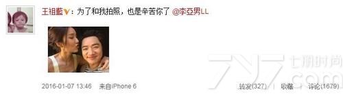 1月7日,王祖蓝在微博上晒出与妻子李亚男的甜蜜自拍照,照片中李亚男嘟嘴亲吻王祖蓝的侧脸。原来合照时李亚男还特意脱掉了高跟鞋,意在减少两人的身高差。不少网友被这样的小细节秀了一脸,纷纷表示李亚男贴心好媳妇。