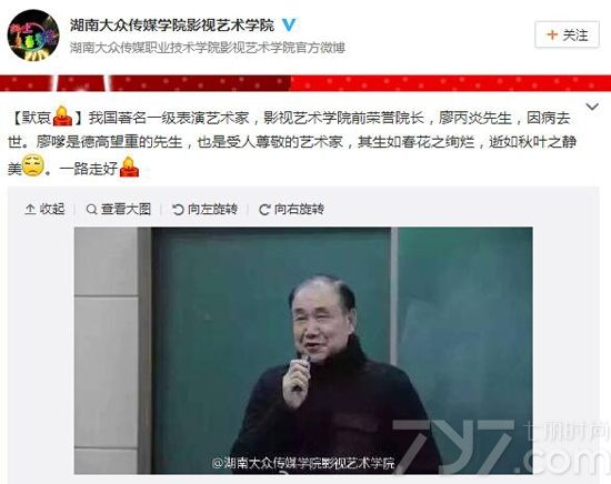 今日凌晨,“湖南大众传媒学院影视艺术学院”官方微博公布著名一级表演艺术家、廖凡父亲廖丙炎因病去世。随后廖凡方面做出了回应,确认了这一噩耗。