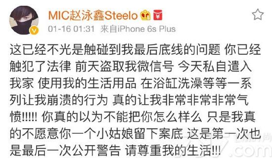 16日,MIC男团成员赵永鑫发布一则长微博,称自己的某个粉丝非法入侵自己家中,被家中监控摄像拍到。警察进屋抓人发现该女子赤身裸体躺在艺人家中的浴缸里洗澡。