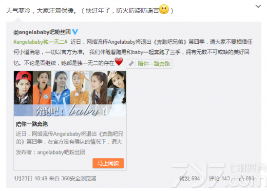 针对Angelababy退出跑男的传闻,粉丝们在微博上发起了呼吁Angelababy继续留在第四季的话题,Angelababy工作室微博在转发相关消息时表示,“天气寒冷,大家注意保暖。快过年了,防火防盗防谣言!”