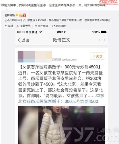 近日,一段“女孩在医院怒斥黄牛”的视频在网络上热传,一个女孩在视频中大骂医院保安和票贩子里应外合,将300元的号炒至4500元,最后还伤心落泪。林更新首先转发了这个视频,怒斥医院“太缺德”。随后,他又发一条微博解释称自己并没有说医生没有医德,罪魁是黄牛,但是医院还是有一点缺德的。