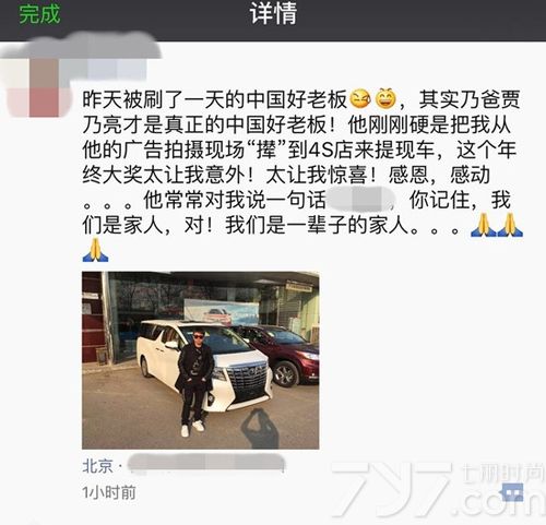 “其实乃爸贾乃亮才是中国好老板,刚刚硬是把我撵到4S店提车,这个年终大奖让我太意外了!”贾乃亮也由此被称为中国好老板。