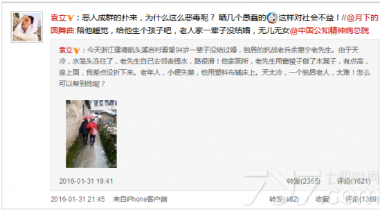 昨晚(31日)袁立晒出探望独居抗战老兵的照片,并表示为他艰苦的生活担忧。此举虽得到大部分网友的支持,但也遭到部分网友恶意评论称她在演戏,太假。更有网友认为袁立和老人的合影P上去的,随后袁立也与部分网友展开了骂战,劝诫对方如有闲工夫不如做点对社会有益的事。